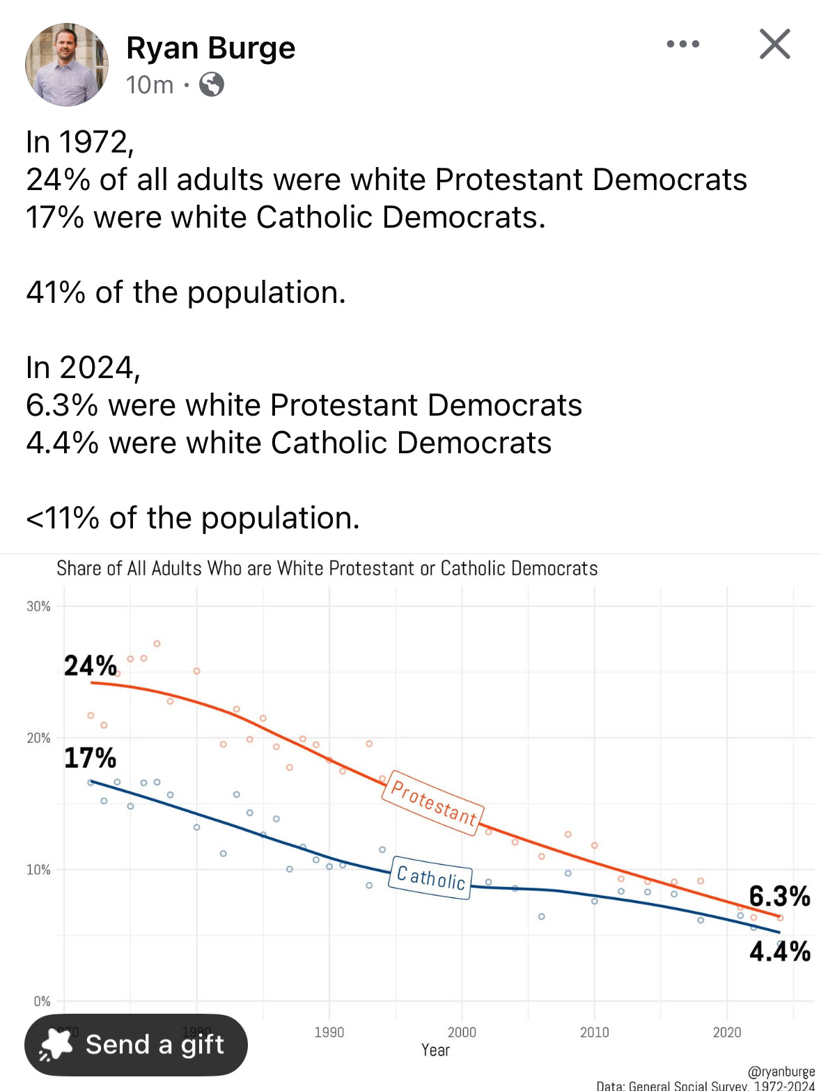 And yet the sociological picture is more complicated than the dominance of conservative campus ministries might suggest. As just one demographic illustration, this chart from Ryan Burge shows a dramatic contraction in the proportion of adults who are white Protestant or white Catholic Democrats: from 41% of the population in 1972 (24% white Protestant Democrats and 17% white Catholic Democrats) to under 11% in 2024 (6.3% and 4.4%, respectively).