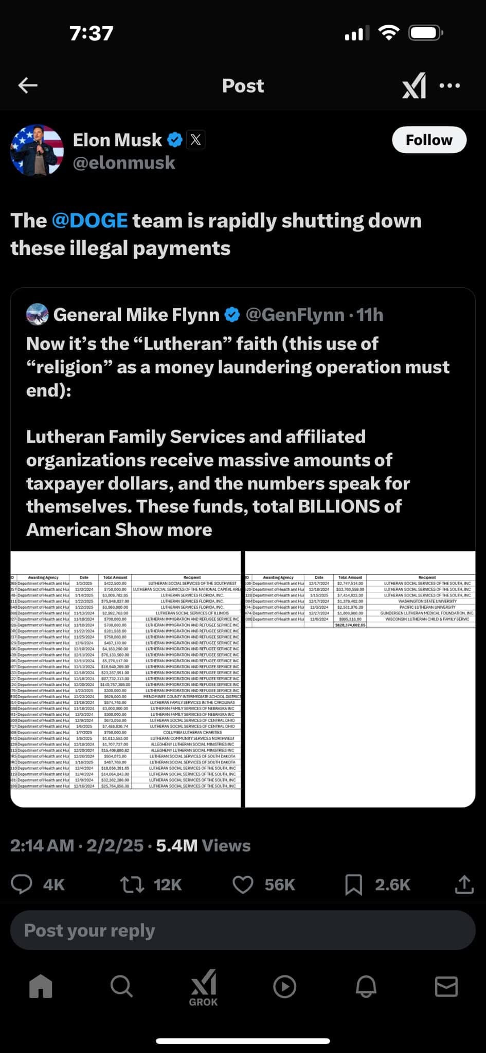 First of all it's crazy because the government also pays billions to Musk's own companies. Why aren’t there screen shots of those payments labeling them “illegal?”